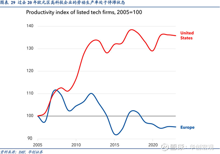 2023年德国经济萎缩0.3%,2024年萎缩0.2%,连续两年衰退,明显拖累了欧元区经济增长。在此基础上,特朗普政府酝酿新一轮关税冲击,无疑会加大成本冲击对于德国乃至整个欧元区制造业的压力。如同前文提到的,2019年四季度以来欧元区生产率增长不及美国的七分之一。长期来看,欧元区劳动生产率增长落后美国的幅度更大。国际货币基金组织(IMF)的数据显示,2005年以来,美国上市科技公司劳动生产率增长接近40%,欧元区同类公司劳动生产率基本不变。为了对冲短期关税冲击叠加能源价格上涨,融资成本快速下行是最佳选项,否则劳动力需求或出现更大范围的减弱,引起名义工资增速骤降。为了对冲长期能源价格上涨,融资成本和工资水平需要维持在较低水平,否则可能出现企业大规模外迁。