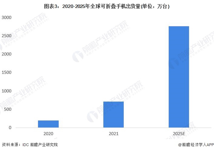 根据IDC数据显示,2021年全球可折叠手机(包括翻盖和折叠屏)出货量总计达到710万部,同比增长了264.3%。IDC预测,到2025年全球可折叠手机出货量将达到2760万部,2020-2025年复合年增长率在70%左右。
