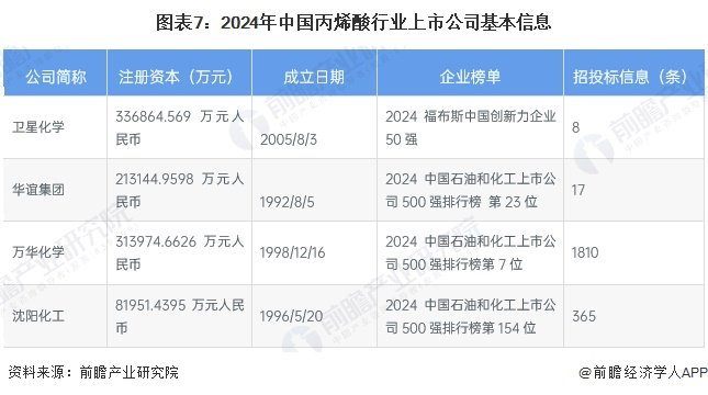 从丙烯酸上市企业布局和已有公开信息分析,注册资本最多的是卫星化学、成立时间最早的是华谊集团、招投标信息最多的是万华化学。