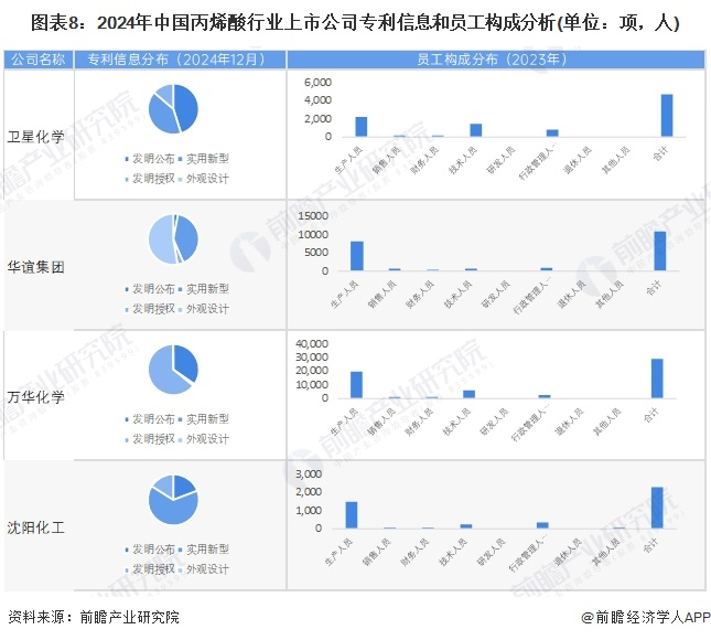 从丙烯酸行业的上市企业已有的公开信息分析,专利数量相对较多的企业是万华化学,其中发明授权专利3279项;员工总数最多的同样是万华化学,员工总数为29053人。