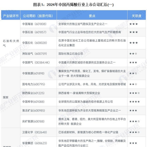目前,我国丙烯酸产业上市企业主要集中在上下游,中游丙烯酸制造环节的上市企业不多,主要包括卫星化学、华谊集团、万华化学、沈阳化工等。