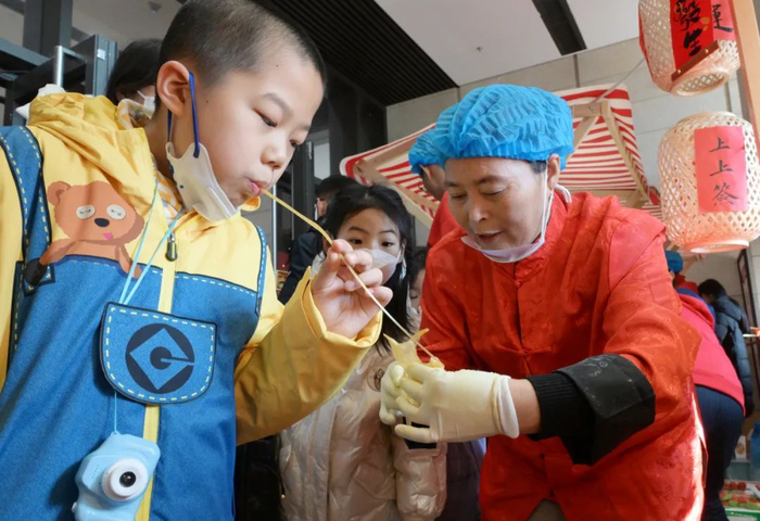 △2025年1月29日,小朋友在位于北京的中国非物质文化遗产馆举行的“过年——春节主题展”上体验“吹糖人”。新华社记者 李贺 摄