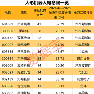 人形机器人量产元年的到来将深刻影响相关上市公司的业绩表现。据数据宝统计,A股2024年前三季度净利润实现增长或2024年业绩预增的人形机器概念股中,机构评级家数超10家且一致预测2024年—2025年净利润复合增速超20%的个股有11只。