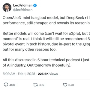 Lex认为,OpenAI的o3 - mini 是个不错的模型,DeepSeek的R1性能和它差不多,但价格更便宜,且能展示推理过程。