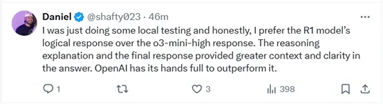 R1非常出色。很庆幸它的出现,它推动了优秀新产品的诞生(Perplexity 基于它的更新令人惊叹)。能有这样出色的开源模型,实在太棒了。