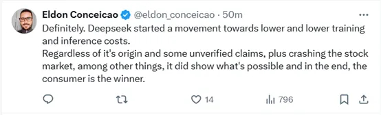 确实如此。DeepSeek开启了一场朝着不断降低训练和推理成本发展的变革。