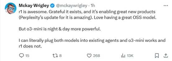 但o3 - mini 的能力要强大得多,二者不可同日而语。我可以直接将这两个模型应用到现有的智能体中,o3 - mini 能正常运作,而R1却不行。