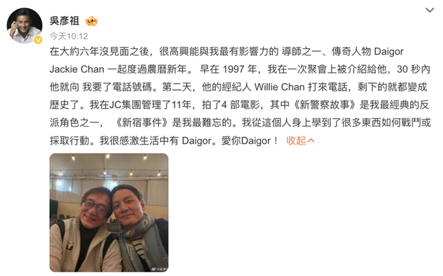 1日上午,吴彦祖在微博晒出与成龙大哥的合照并发文表示,六年没见面,很高兴能与最有影响力的导师之一、传奇人物Daigor Jackie Chan一起度过农历新年。同时还回忆了自己与成龙合作的电影《新警察故事》、《新宿事件》。