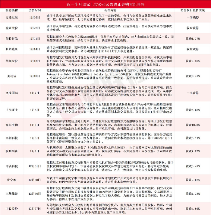 财联社2月1日讯(编辑 若宇)据财联社不完全统计,截至发稿,近一个月(2024.12.27-2025.1.27)包括万通发展、金证股份、朗特智能、长龄液压、华斯股份、美利信、奥康国际、上海莱士、海尔生物、必创科技、杭州高新、中英科技、优宁维、三峡旅游、中设股份在内的15家A股上市公司公告终止并购重组事项,详细情况见下图: