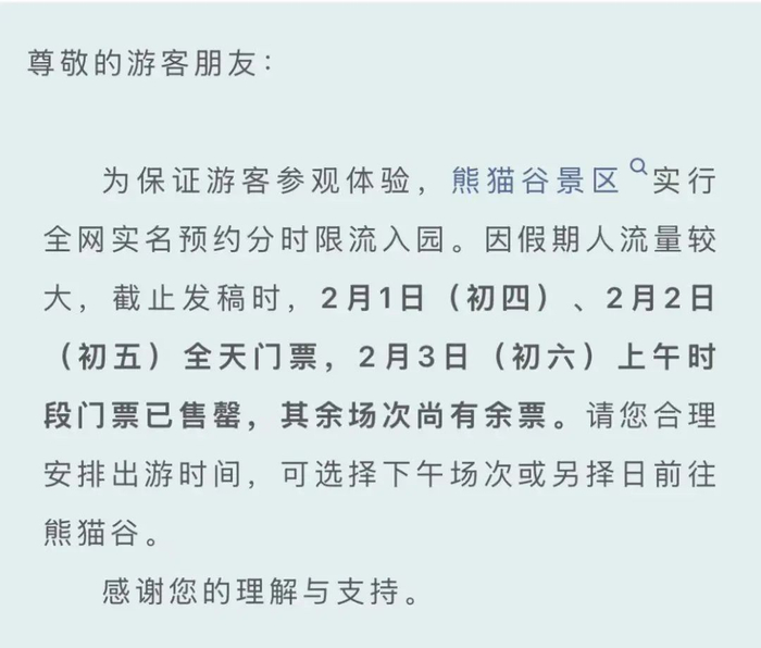 成都大熊猫繁育研究基地熊猫谷景区正月初四、初五全天、初六上午时段门票已售罄。