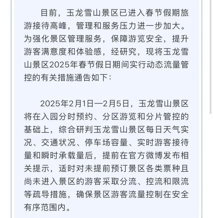 云南丽江玉龙雪山省级旅游开发区管理委员会2月1日凌晨发布通告称,目前,玉龙雪山景区已进入春节假期旅游接待高峰,景区2025年春节假日期间将实行动态流量管控。