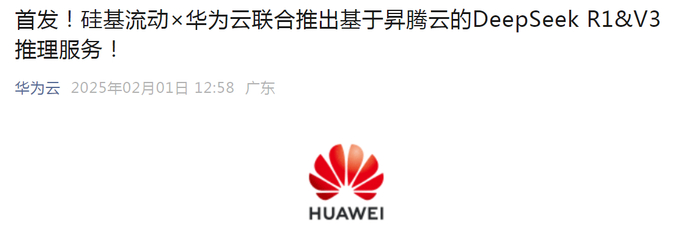 据华为云官方微信公众号2月1日消息,DeepSeek-R1开源后引发全球用户和开发者关注。经过硅基流动和华为云团队连日攻坚,现在,双方联合首发并上线基于华为云昇腾云服务的DeepSeekR1/V3推理服务。