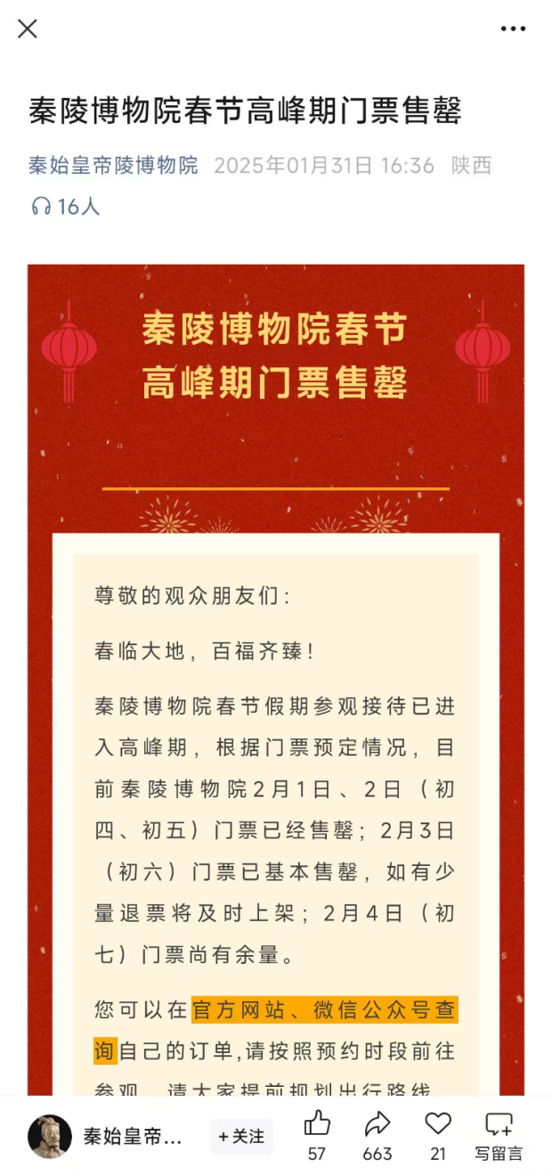 门票售罄公告。秦始皇帝陵博物院官方公众号