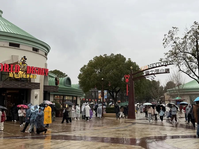 尽管阴雨连绵,但迪士尼小镇和世界商店内依然有不少游客。沈思怡 摄