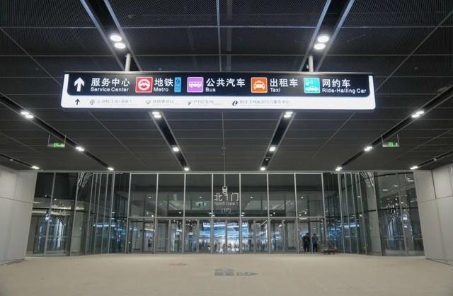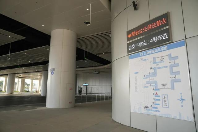 旅客从南区出站后,沿着通道步行,穿过门往左转,往前走,即可看到位于右前方的公交枢纽。