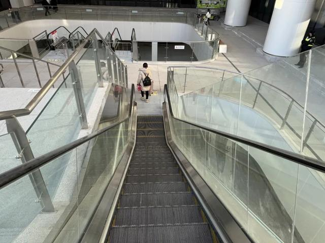 旅客从南区出站后,沿着通道步行,穿过门往左转,向前步行至扶梯口。