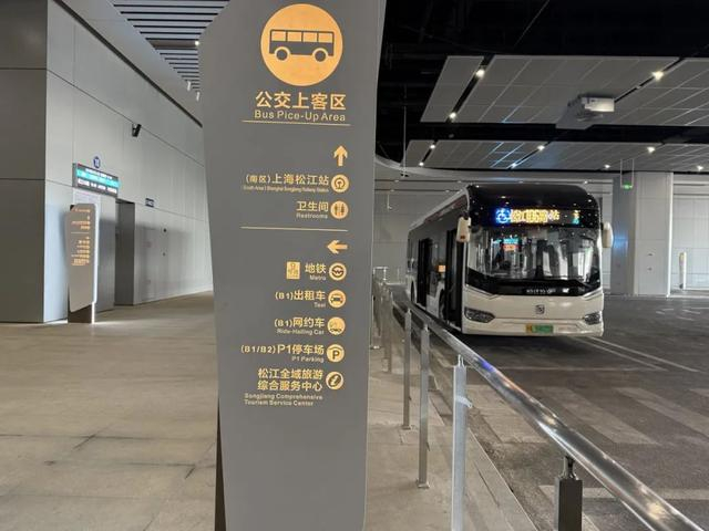 换乘公交的旅客从北区出站后,向右转,往前走,即可看到位于扶梯左侧的公交枢纽。