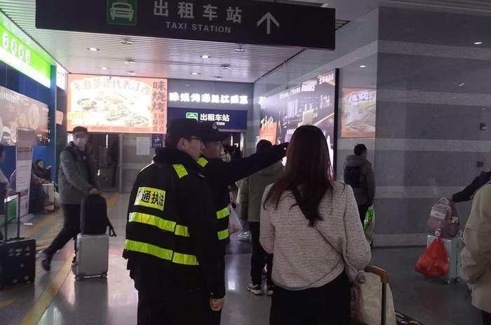 “呼叫指挥中心,呼叫指挥中心,预计未来2小时内将到达近4500人,目前高铁北站南广场出租车上车点车辆不多了,请尽快调度……”“收到,我们现在向出租车内设备发出语音指令。”1月31日13时40分,在高铁北站南广场出租车上车点,面对即将到来的客流高峰,交通运输执法人员一边引导旅客有序上车,一边时刻关注出租车上车点营运运力,紧急调度出租车。