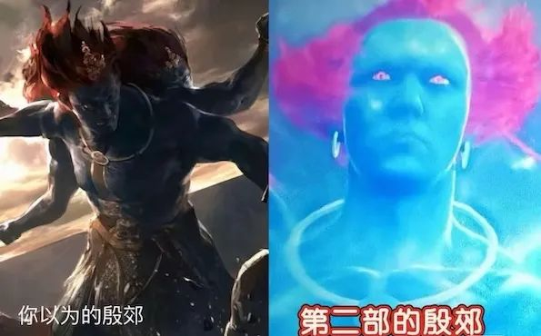殷郊(陈牧驰 饰)得元始天尊(陈坤 饰)之力“接头”复生,拥有了“三头六臂”的强大法相,但其法相幽默得跟其他角色似乎不在一个图层,“比闻太师的坐骑差了十个绿巨人吧”。
