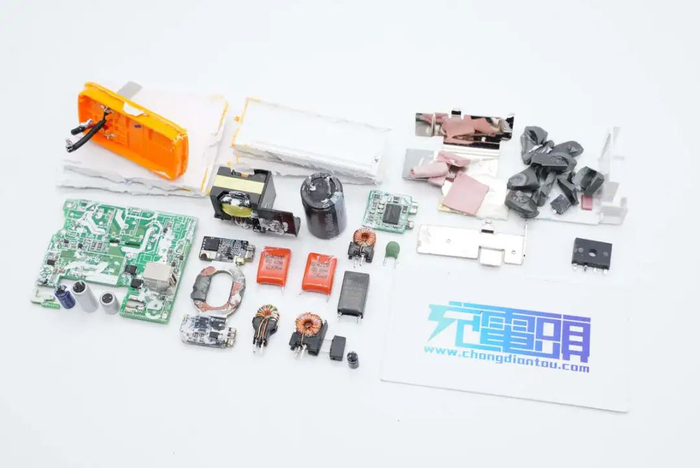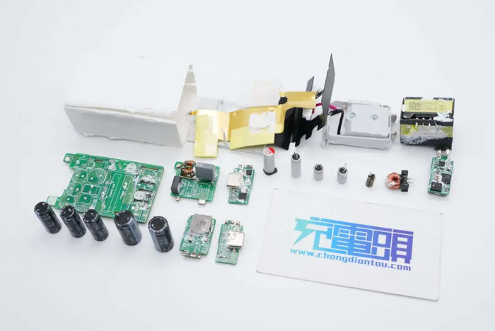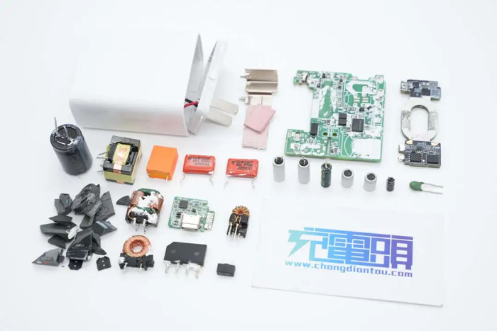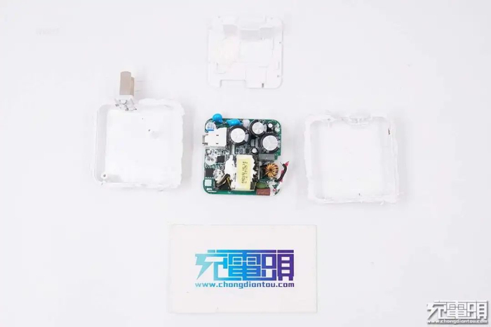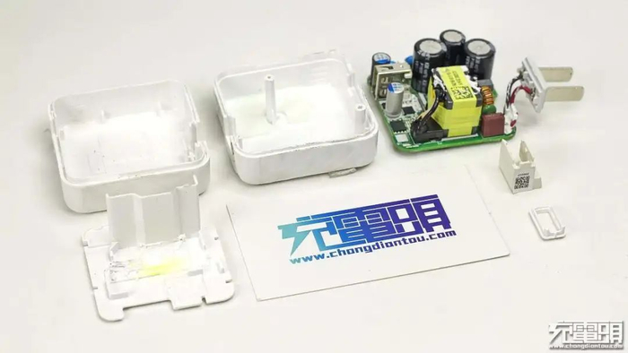同时充电器内部使用了大面积的散热片,解决大功率输出的散热问题,并且原器件之间也均有打胶固定,增加焊接可靠性。用料均为业界知名知名品牌,做工处于行业中上水准。