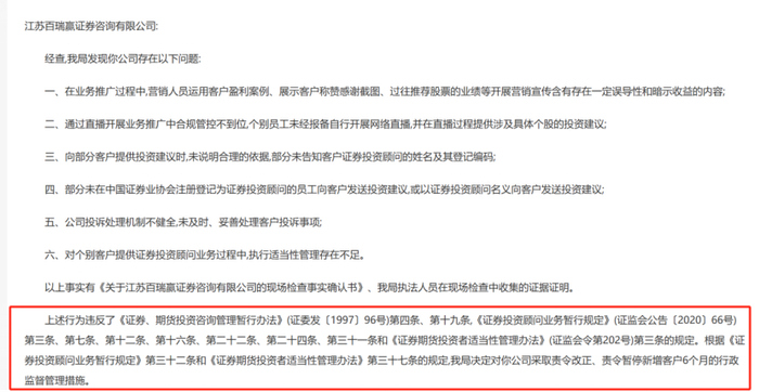 江苏证监局表示,以上事实有《关于江苏百瑞赢证券咨询有限公司的现场检查事实确认书》、该局执法人员在现场检查中收集的证据证明。上述行为违反了《证券、期货投资咨询管理暂行办法》等相关规定,决定对江苏百瑞赢采取责令改正、责令暂停新增客户6个月的行政监督管理措施。