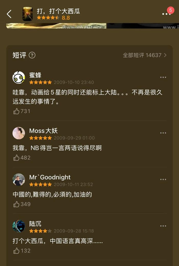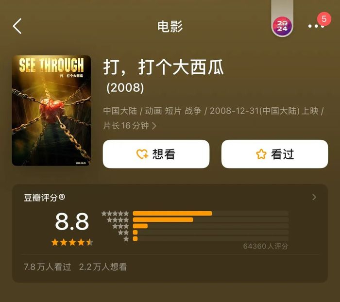 《打,打个大西瓜》在豆瓣拿下了8.8的高分,被网友称为“华人最牛原创动画短片”, “国内最具内涵动画片”,在国内外共获得27个专业大赛的30多个奖项,成为动画专业的学生无人不知的影片。