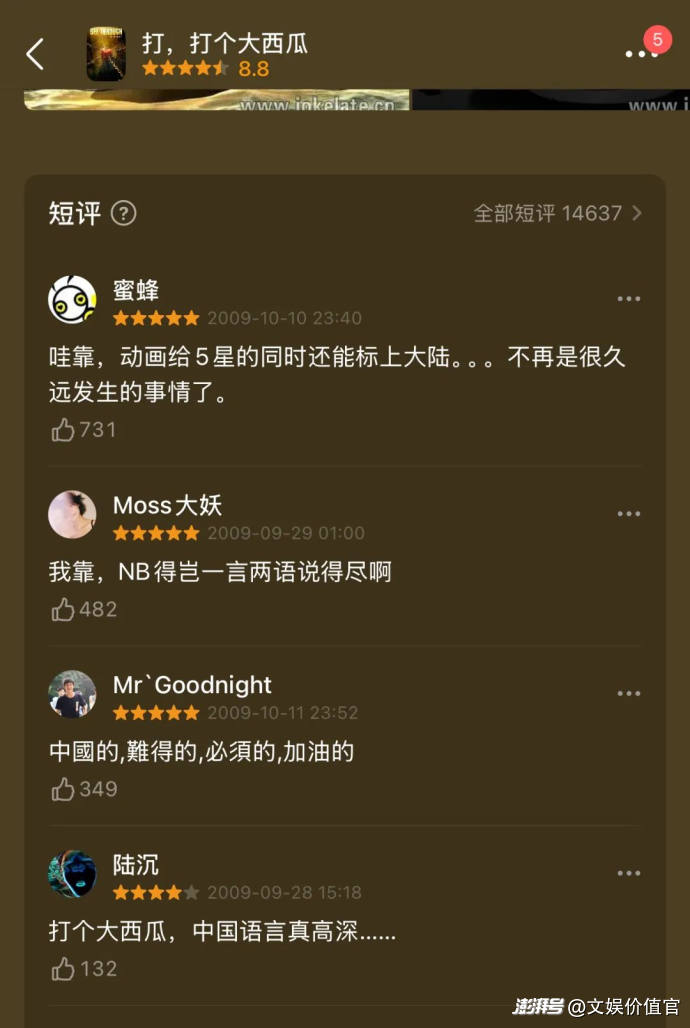 《打,打个大西瓜》在豆瓣拿下了8.8的高分,被网友称为“华人最牛原创动画短片”, “国内最具内涵动画片”,在国内外共获得27个专业大赛的30多个奖项,成为动画专业的学生无人不知的影片。