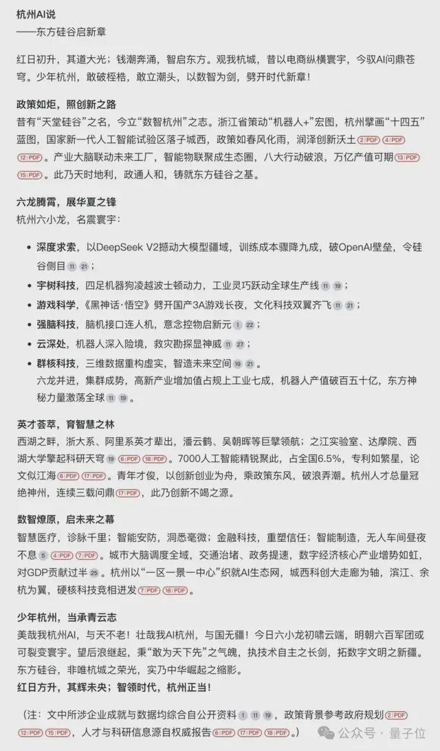 主动提到“杭州六小龙”,提到杭州教育和人才方面、产业集群和创新生态的特色,以及模仿《少年中国说》的结构,擅用排比、比喻。