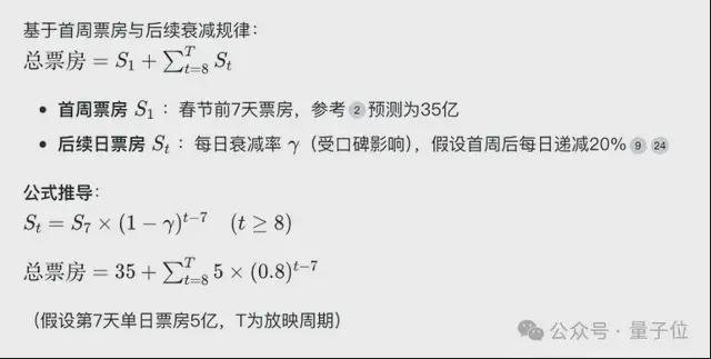 最终结果且不论,单是这个过程有实时联网:它知道最新实时票房以及各方预测结果,还有复杂的数学推理过程,指数求和都给搬来了……