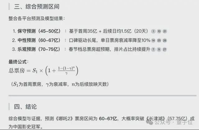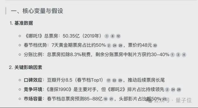 它结合海量搜索到的材料,想到多个可能的变量因素(比如首周票房和衰减率、观影人次、分账比例等),可能的建模步骤和模型等等,最终确定了基准数据和三大关键影响因素(口碑效应、竞争环境、市场容量)。