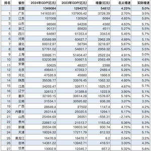 比较地方经济的发展速度,按现价计算的名义GDP增速,比按不变价计算的实际GDP增速更有参考价值。目前,全国31个省份(不含港澳台)均已公布2024年GDP数据,各省份的GDP名义增速排名如何?