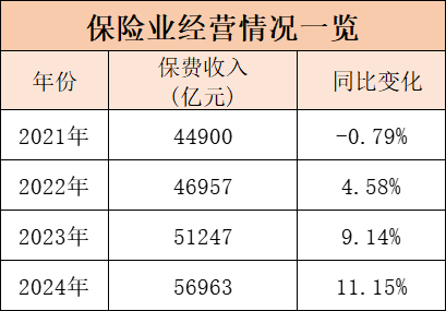 数据显示,2024年保险业实现原保险保费收入约5.7万亿元,同比增长11.15%,较2023年上升2.01个百分点。这也是保险业深度转型以来,原保险保费收入连续第三年实现增长。