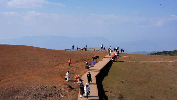 春节假期,乌蒙大草原迎来八方游客。天池景点热闹非凡,游客纷纷拍照打卡,品尝特色美食,购买民族服饰。木栈道和山顶游人如织,大家在蓝天白云下观赏风车、放风筝、吹泡泡,尽情享受大自然美景,放松心情。
