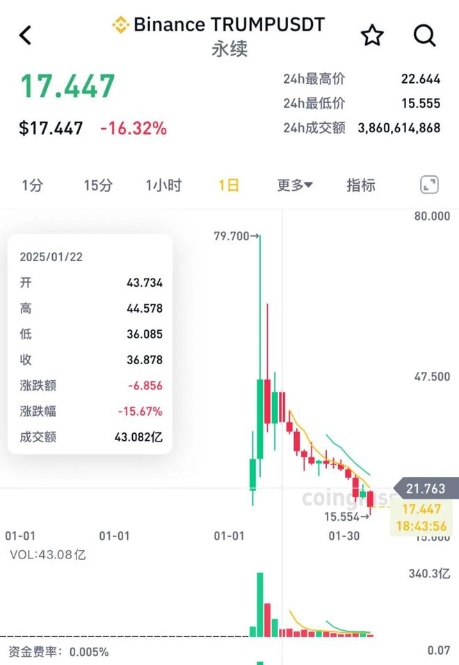 短短12个交易日,TRUMP币价格也从43美元/枚一路下滑,2月3日下跌触及15.554美元/枚,24小时内跌幅高达17%。