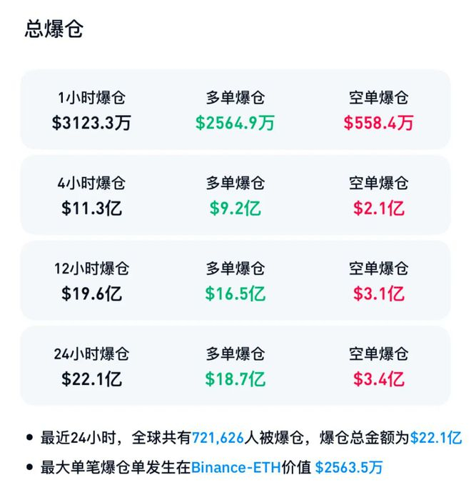 CoinGlass数据显示,最近24小时内,加密货币市场爆仓人数高达72万人,爆仓总金额高达22.1亿美元。其中,多单爆仓金额达到18.7亿美元,空单爆仓金额达到3.4亿美元。