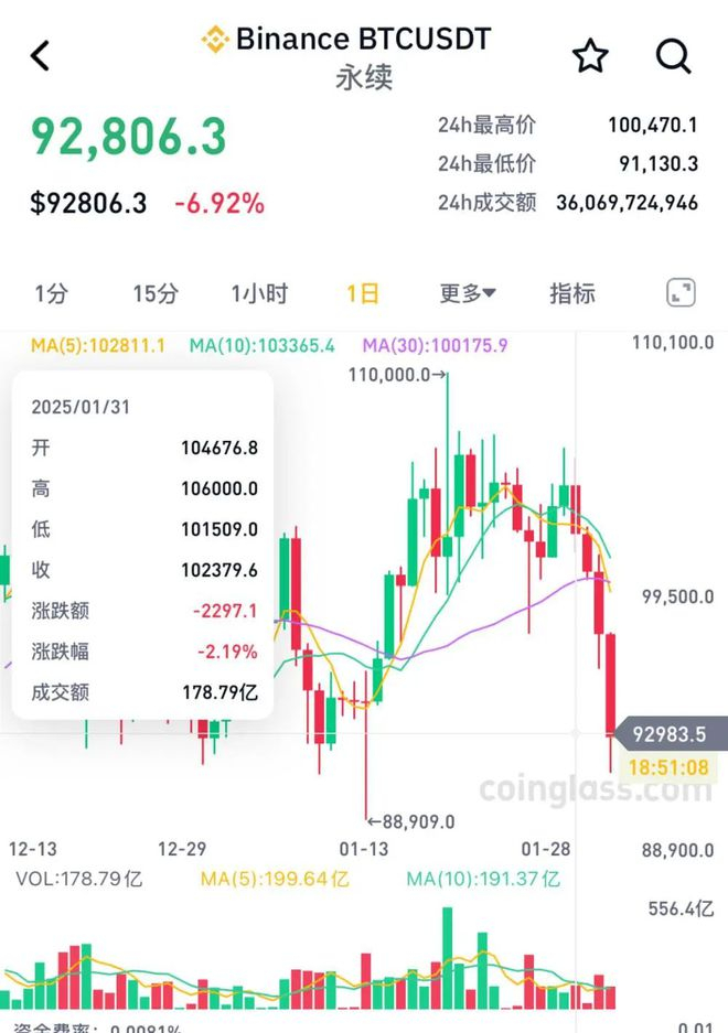 据CoinGlass行情数据,过去几个小时,比特币价格持续走低,一度下探91130美元/枚附近。截至记者发稿,比特币报92899.3美元/枚,跌幅达6.83%。
