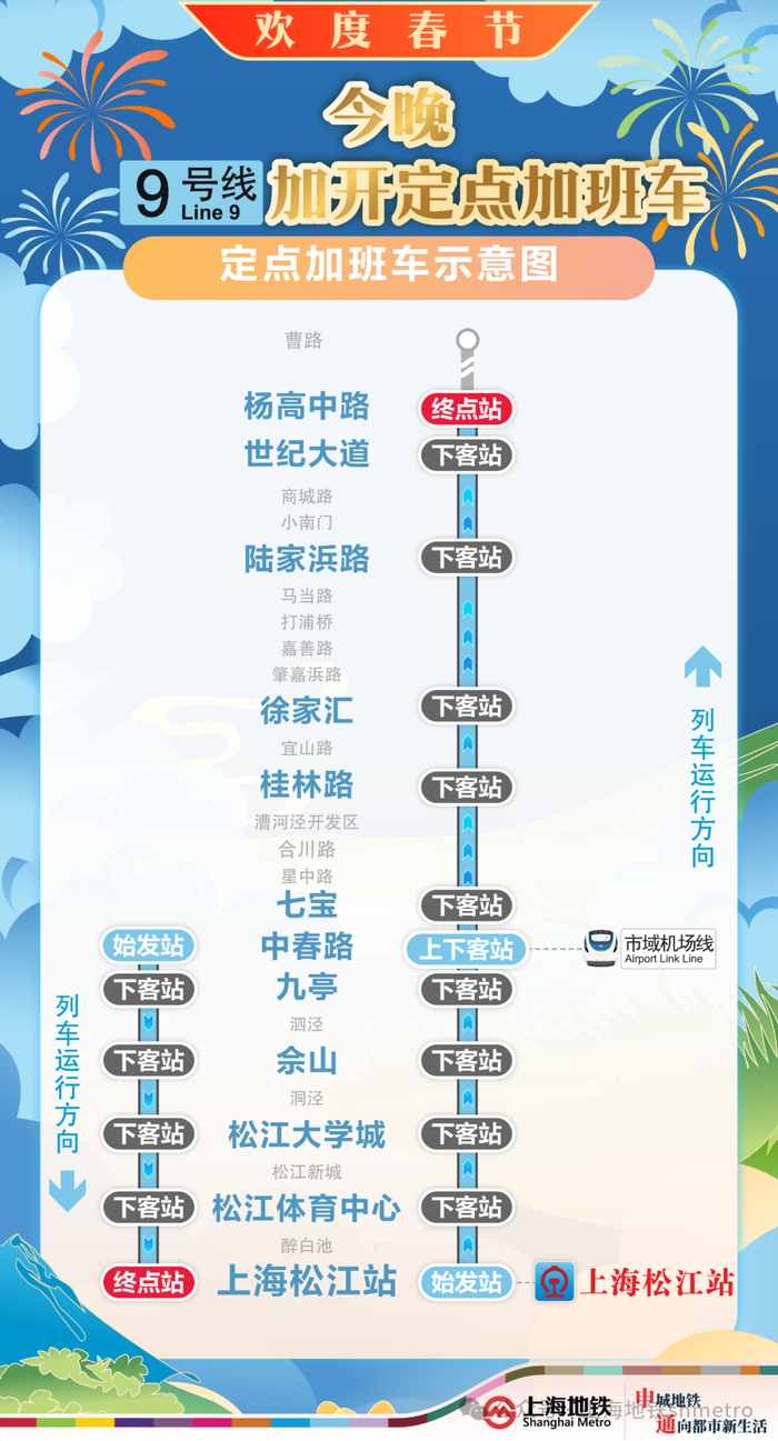 【9号线:上海松江站站往杨高中路站方向】在上海松江站站末班车(22:30)后往杨高中路站方向加开定点加班车至次日0时。加班车停靠:上海松江站站、松江体育中心站、松江大学城站、佘山站、九亭站、中春路站、七宝站、桂林路站、徐家汇站、陆家浜路站、世纪大道站、杨高中路站(终点站),其余车站跳停。停靠车站中,上海松江站站(始发站)、中春路站可上下客,其余车站只下不上。其中,换乘时段内,在中春路站可换乘市域机场线加开列车。