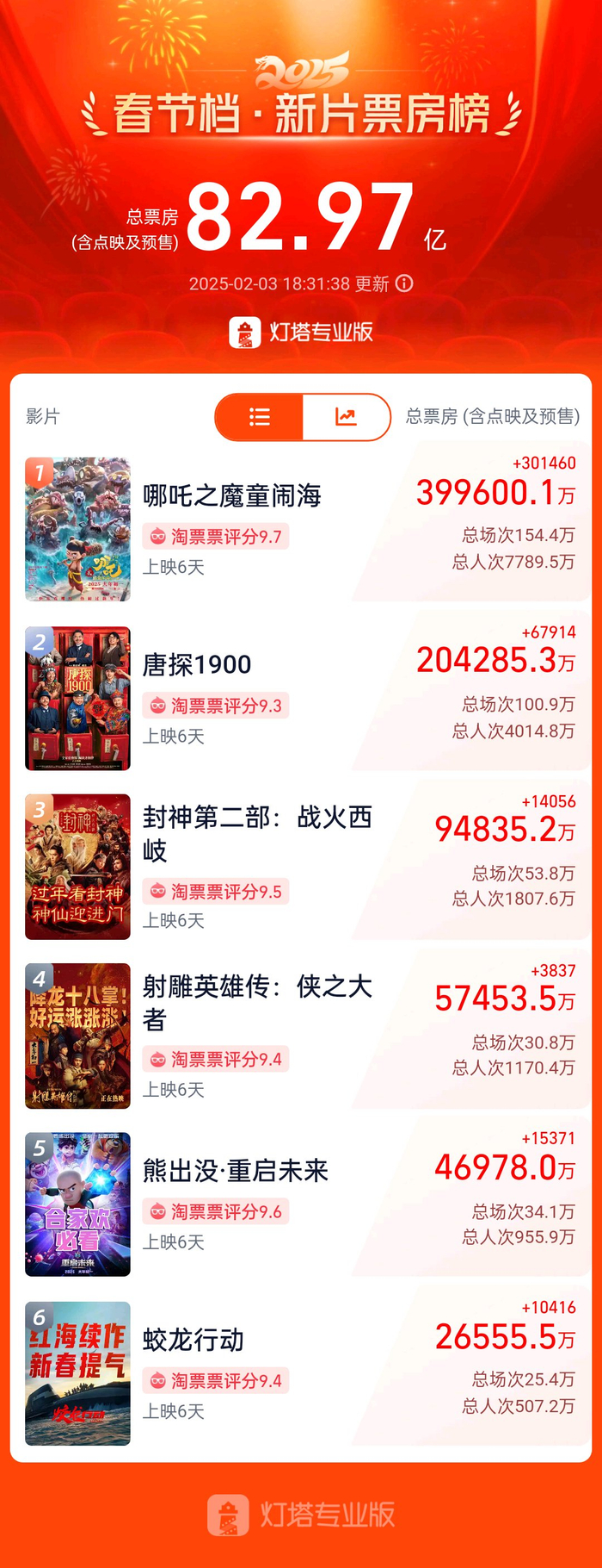 截至记者发稿时,2025春节总票房为82.97亿元,刷新了中国影史春节档票房纪录,其中《哪吒2》票房为39.9亿元,占比近一半。