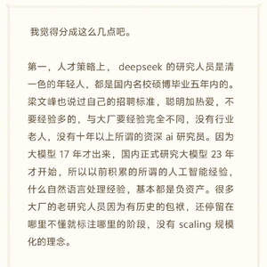 第一,人才策略上,deepseek的研究人员是清一色的年轻人,都是国内名校硕博毕业五年内的。梁文峰也说过自己的招聘标准,聪明加热爱,不要经验多的,与大厂要经验完全不同,没有行业老人,没有十年以上所谓的资深ai研究员。因为大模型17年才出来,国内正式研究大模型23 年才开始,所以以前积累的所谓的人工智能经验,什么自然语言处理经验,基本都是负资产。很多大厂的老研究人员因为有历史的包袱,还停留在哪里不懂就标注哪里的阶段,没有scaling规模化的理念。