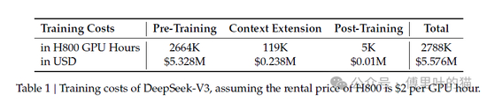 其实网上的这些说法,DeepSeek从来没有说过,只不过在论文中提到了自己的训练成本是5.576M USD,也就是557.6万美元。这当然不是总成本,而且还差别非常大。