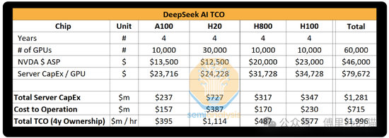 DeepSeek是否拥有或租用了这些GPU尚不清楚。假设DeepSeek拥有这些GPU,则其总拥有成本(TCO)将包括硬件采购、电力消耗和其他运营成本。