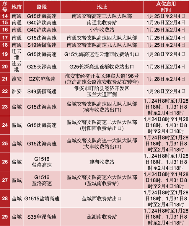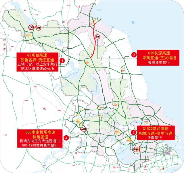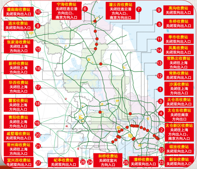 G2京沪高速沭阳北往上海方向;G15沈海高速赣榆港、连云港西、连云港北、海头、罗阳、新坝、赣榆双向;G25长深高速灌南往南京方向;G40沪陕高速广陵往南京方向,九华双向;G1515盐靖高速张庄、大冈双向;G1516盐洛高速泗阳、泗阳东、凌桥、界集、泗洪北、洋河东双向;G2513淮徐高速徐州机场、宿迁西双向;G4011扬溧高速镇江西往溧阳方向;S16连宿高速沭阳南双向;S28启扬高速扬州西往润扬大桥方向;S49新扬高速双沟、管仲、黄花塘、盱眙、陈集、蜀冈双向,刘集往扬州方向收费站入口关闭。