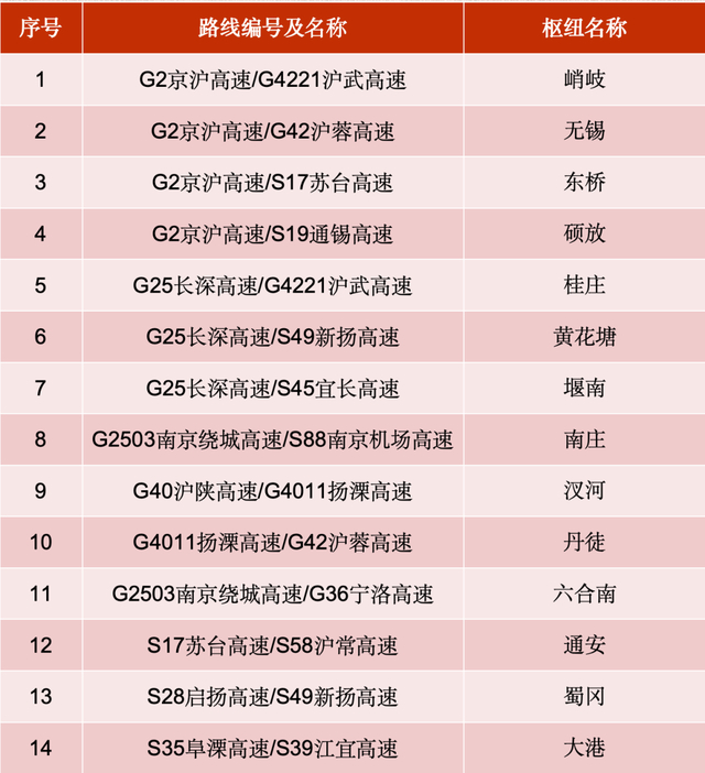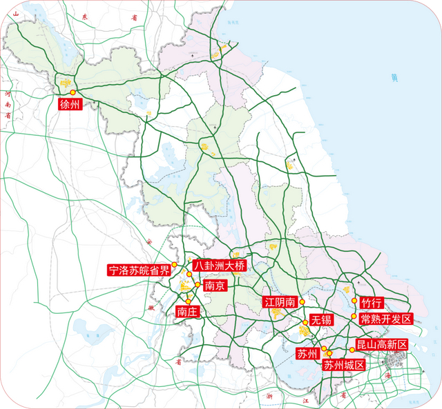 1、由北往南方向:江阴大桥、苏通大桥、沪苏通大桥,G2京沪高速宿迁、淮安、扬州、广靖段,G15沈海高速连云港、盐城、南通、苏州段,G25长深高速连云港、南京、常州段,G1515盐靖高速泰州段,G4011扬溧高速镇江段,S19通锡高速南通段,S35阜溧高速泰州段,S39江宜高速镇江段,S49新扬高速宿迁、淮安、扬州段;