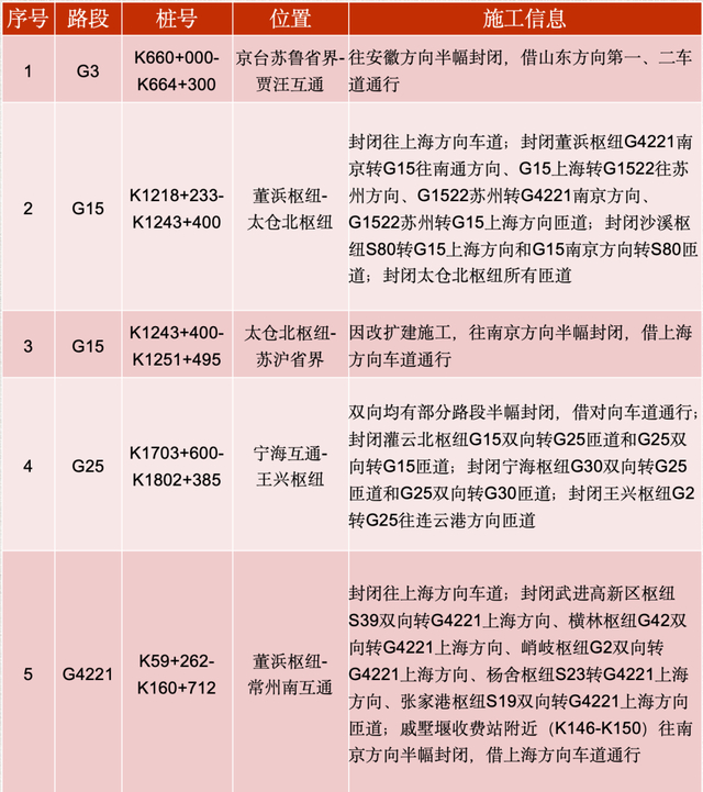 返程期间,因施工改扩建临时关闭G2京沪高速、G25长深高速、G4221沪武高速、S48沪宜高速等高速公路沿线共9个服务区,主要有服务区关闭、加油站关闭等特情,请注意!