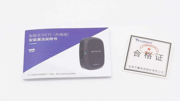 包装内除ETCSP智能无卡ETC外,还有安装激活说明书和产品合格证。