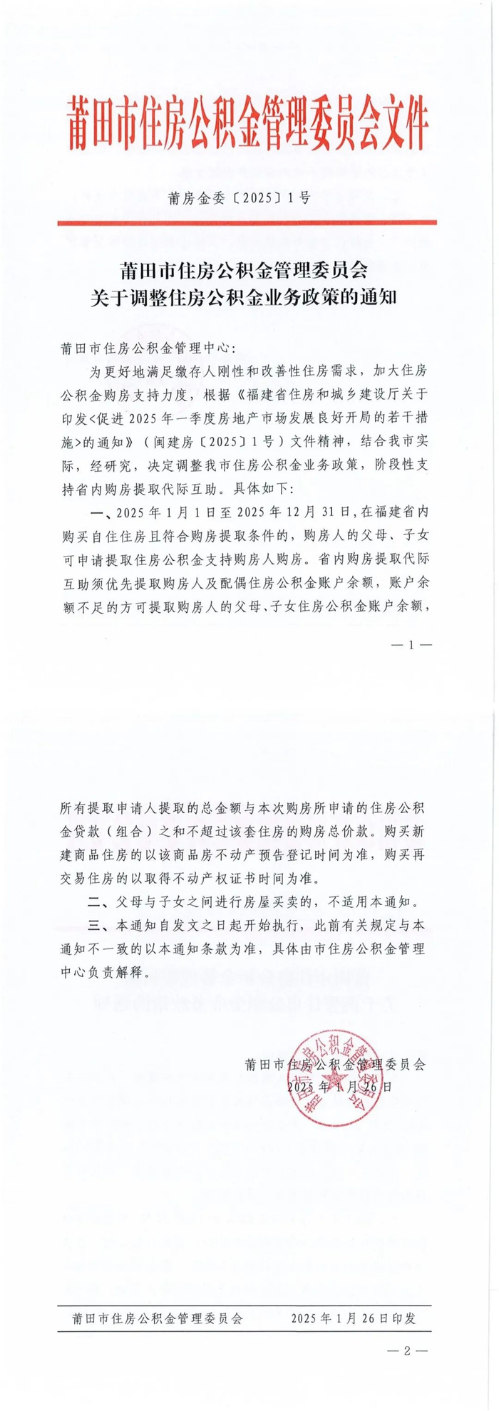 1月26日,莆田市住房公积金管理委员会发布最新通知,调整住房公积金业务政策。