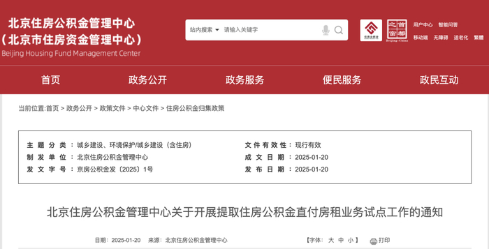 1月20日,北京住房公积金管理中心发布《北京住房公积金管理中心关于开展提取住房公积金直付房租业务试点工作的通知》。