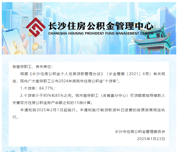 通知明确,2024年底长沙市住房公积金个贷率为84.77%。个贷率介于80%和85%之间,长沙市缴存职工(含省直分中心)可贷额度按照借款人夫妻双方住房公积金账户余额之和的15倍计算。通知自2025年2月1日起施行。通知施行前贷款资料已进窗的按原政策规定执行。