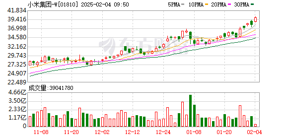 但市场目前最关注的还是小米。截至2月3日盘中,小米股价一度站上39港元/股,刷新历史新高,短线走势强劲。