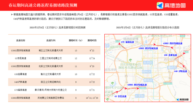 据西安交警发布道路交通拥堵预测,预计今年春运拥堵集中在节前1月22日至26日(小年至除夕前两日)、节中2月1日至4日(正月初四至初七)、节后2月6日至10日(正月初九至十三),拥堵时段主要集中在每日的9至11时、13至19时。